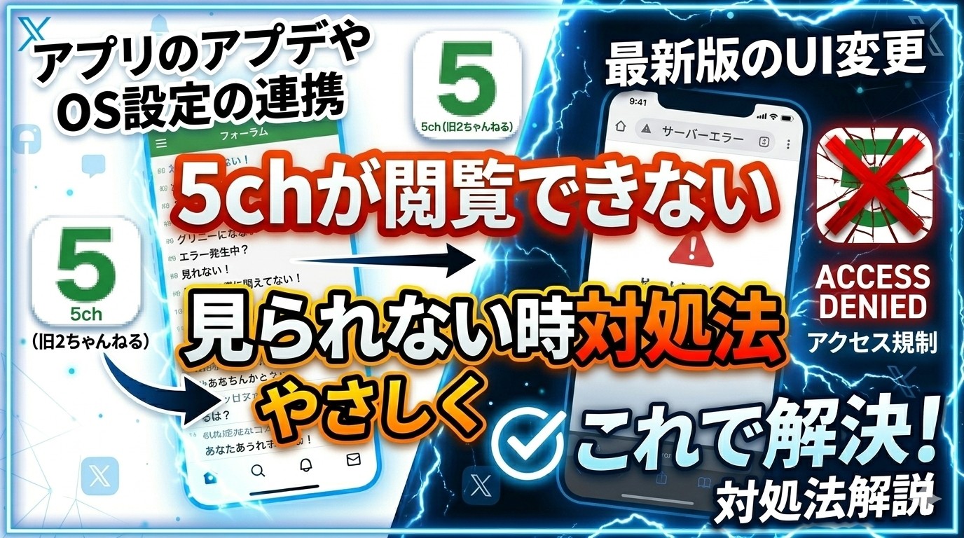 5ch側の障害やアクセス集中、2026年3月のようなドメインまわりの変化が影響している場合は、個人の端末だけの問題ではない可能性が高いです。